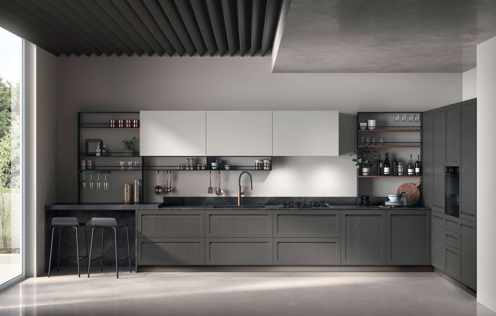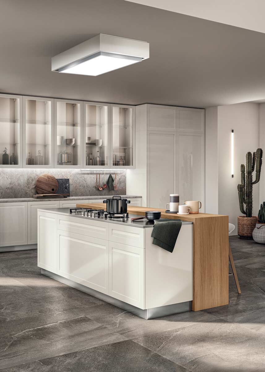 Carattere rappresenta un modello di eleganza raffinata capace di vestire con stile ogni tipo di ambiente, piccolo o grande. L’anta telaio ne costituisce la cifra stilistica. Il suo richiamo all’equilibrio delle proporzioni classiche viene armonizzato con le forme pulite e caratteristiche del gusto contemporaneo. Il tutto permette di realizzare soluzioni raffinate e funzionali in ogni dettaglio.