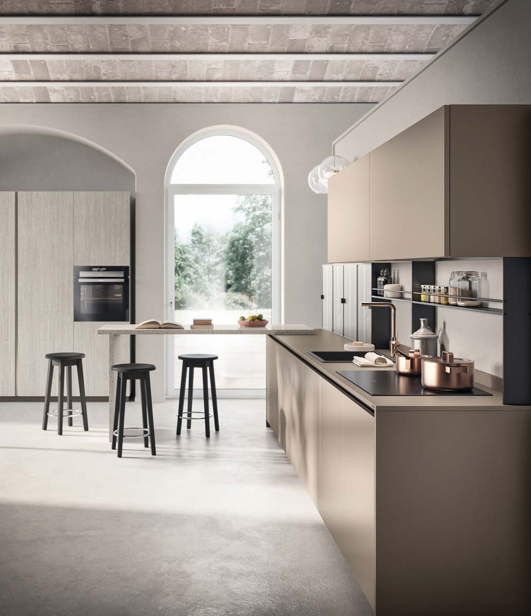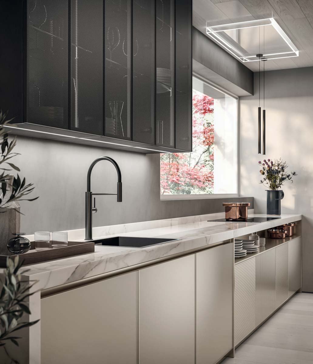 Libra si contraddistingue per l’alto livello estetico conferito dal design dell’anta piana, dalle finiture dedicate e inedite: un abbinamento in grado di definire ogni proposta con un’allure sofisticata e contemporanea. Le nuove varianti di colori e materiali permettono di creare differenti combinazioni, stimolando suggestive sensazioni tattili e visive. La cura dei dettagli si esprime anche attraverso l’apertura dell’anta a gola che, oltre a rappresentare un elemento funzionale, aumenta la leggerezza dei volumi e garantisce una visione completa dei frontali facendo risaltare al meglio le finiture.