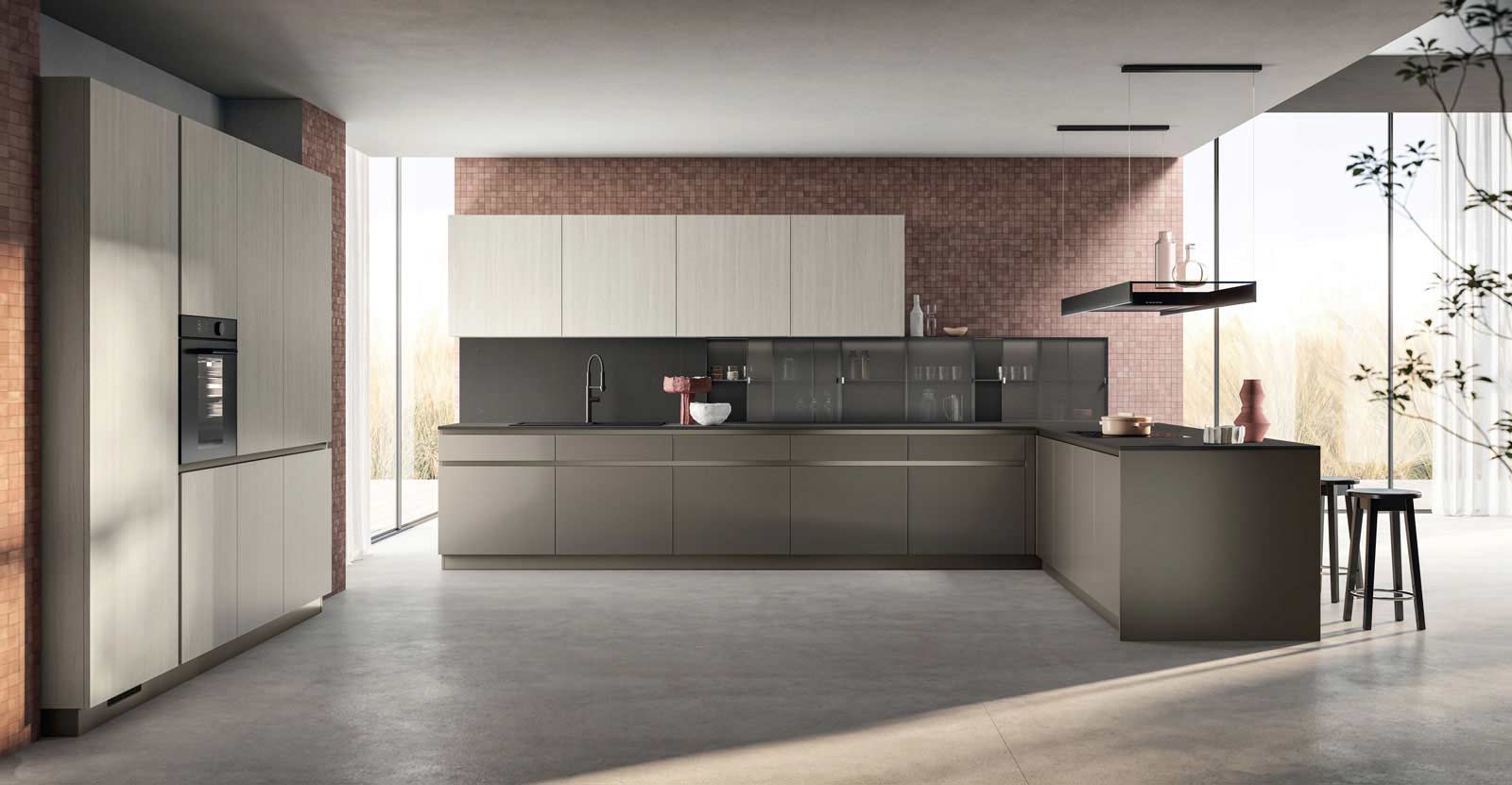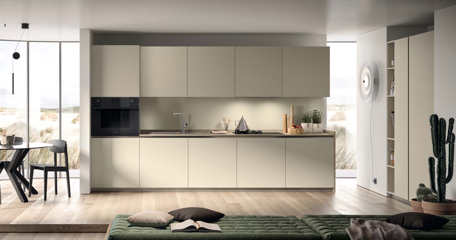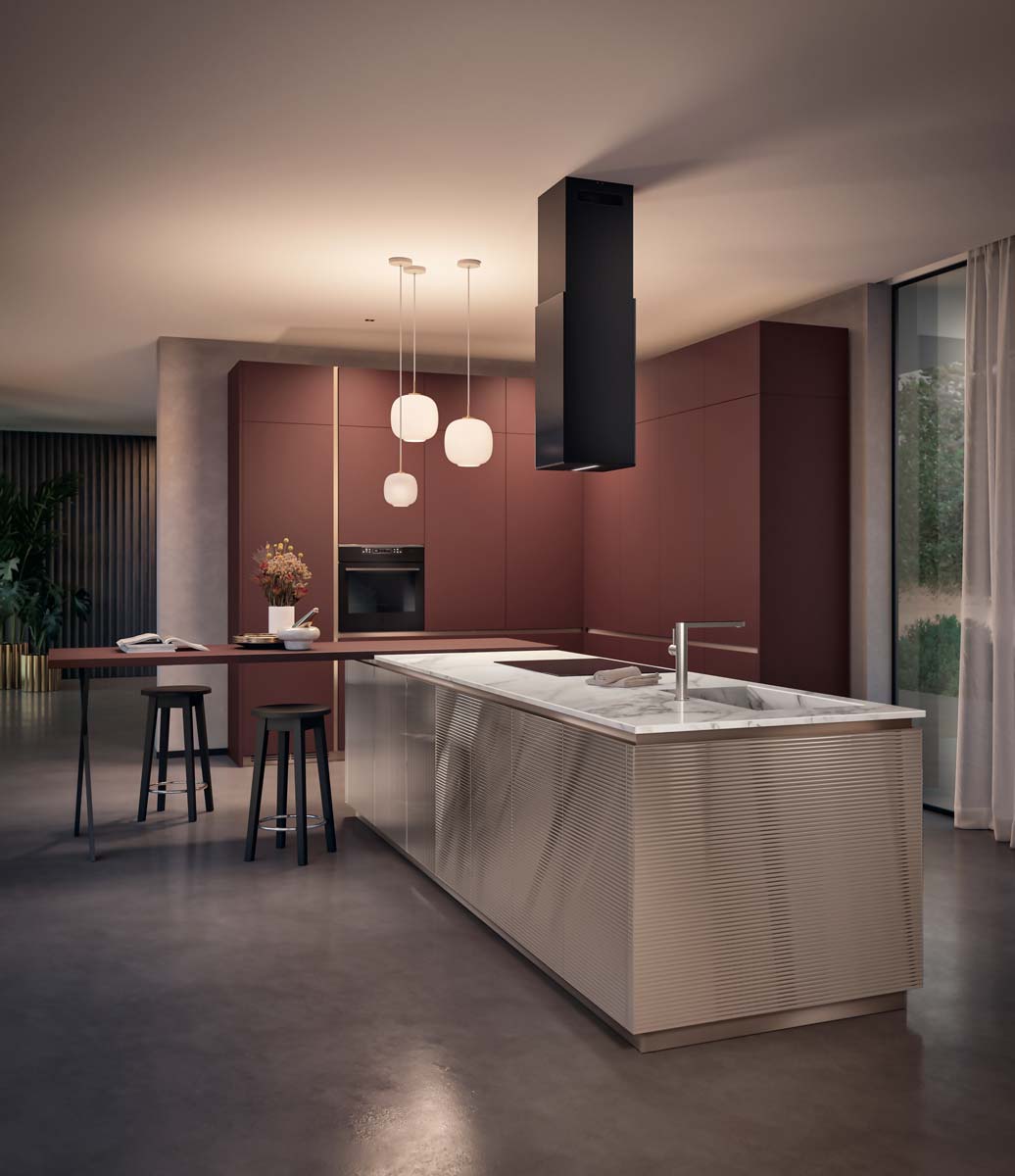 Lumina, una proposta sofisticata, caratterizzata dalla pulizia formale, flessibilità e ricerca stilistica. Si distingue per l’estrema cura dei dettagli ed è pensata per chi ama circondarsi di arredi dalla spiccata personalità. Nuove finiture disponibili in tre nuance dall’effetto perlescente, in grado di definire ogni proposta con un design moderno e raffinato; sono disponibili anche per i frontali in vetro, oltre che con estetica canneté: in questo modo è possibile donare ad ogni singolo progetto una originale chiave di lettura. Dal punto di vista stilistico, elemento caratterizzante del modello è l’anta inclinata a 40° per una maggiore ergonomia della presa in abbinamento a due tipologie di gola.