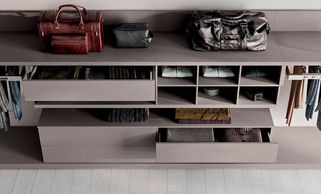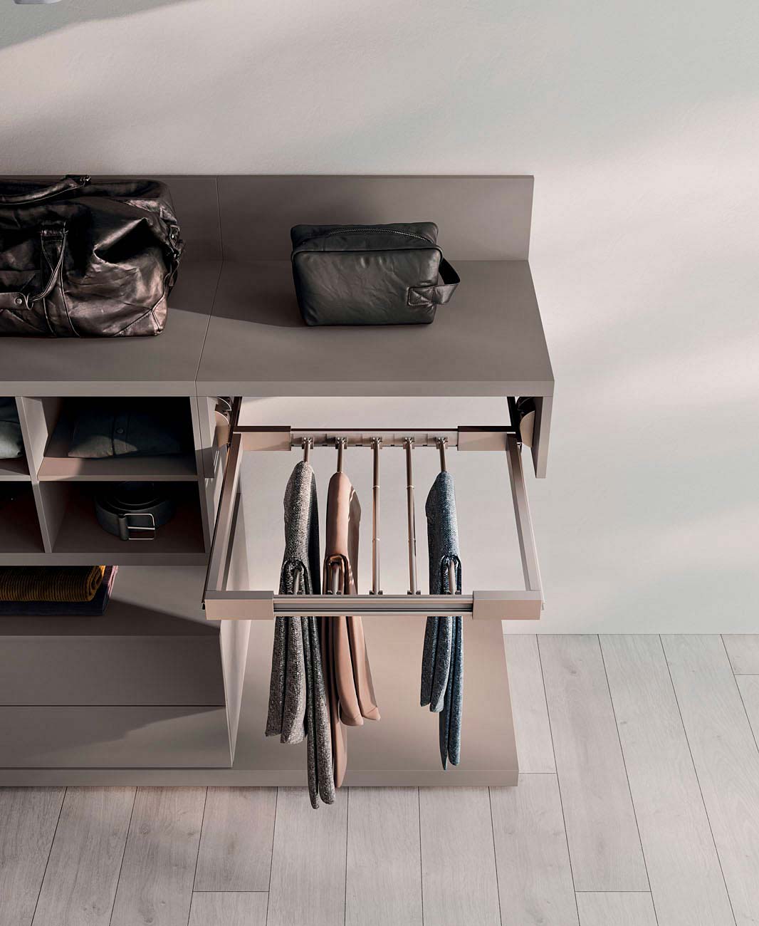 La cabina armadio Alea è composta da mensole con gli accessori integrati per completare la funzionalità dello spazio. La mensola è possibile averla nelle finiture melaminiche o laccate, mentre gli accessori sono in metallo antracite. La composizione viene completata dall’aggiunta di cassettiere sospese o appoggiate su una pedana che riprende la forma della mensola, protagonista del modello Alea.