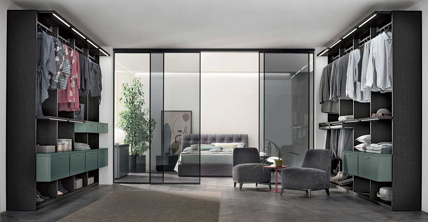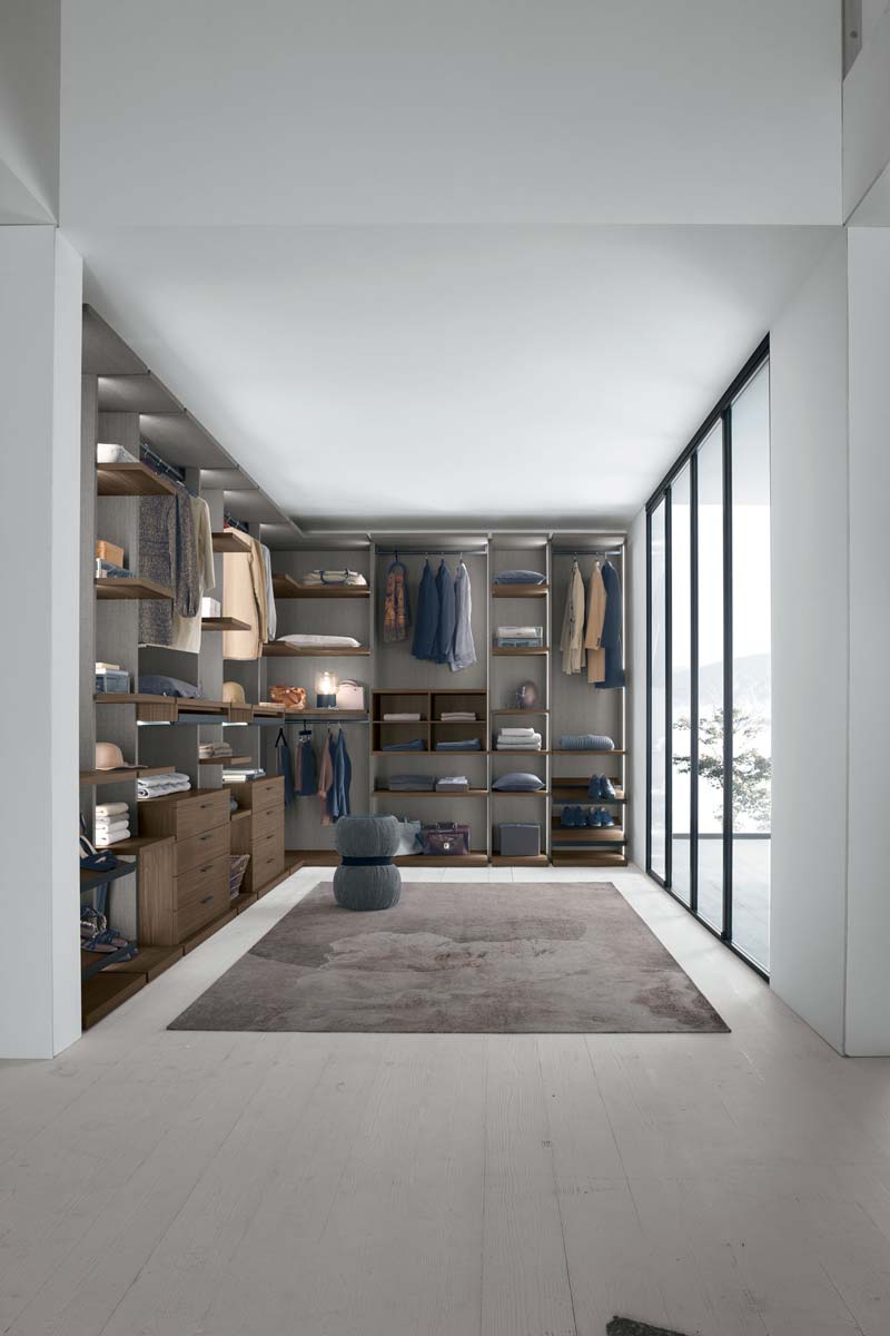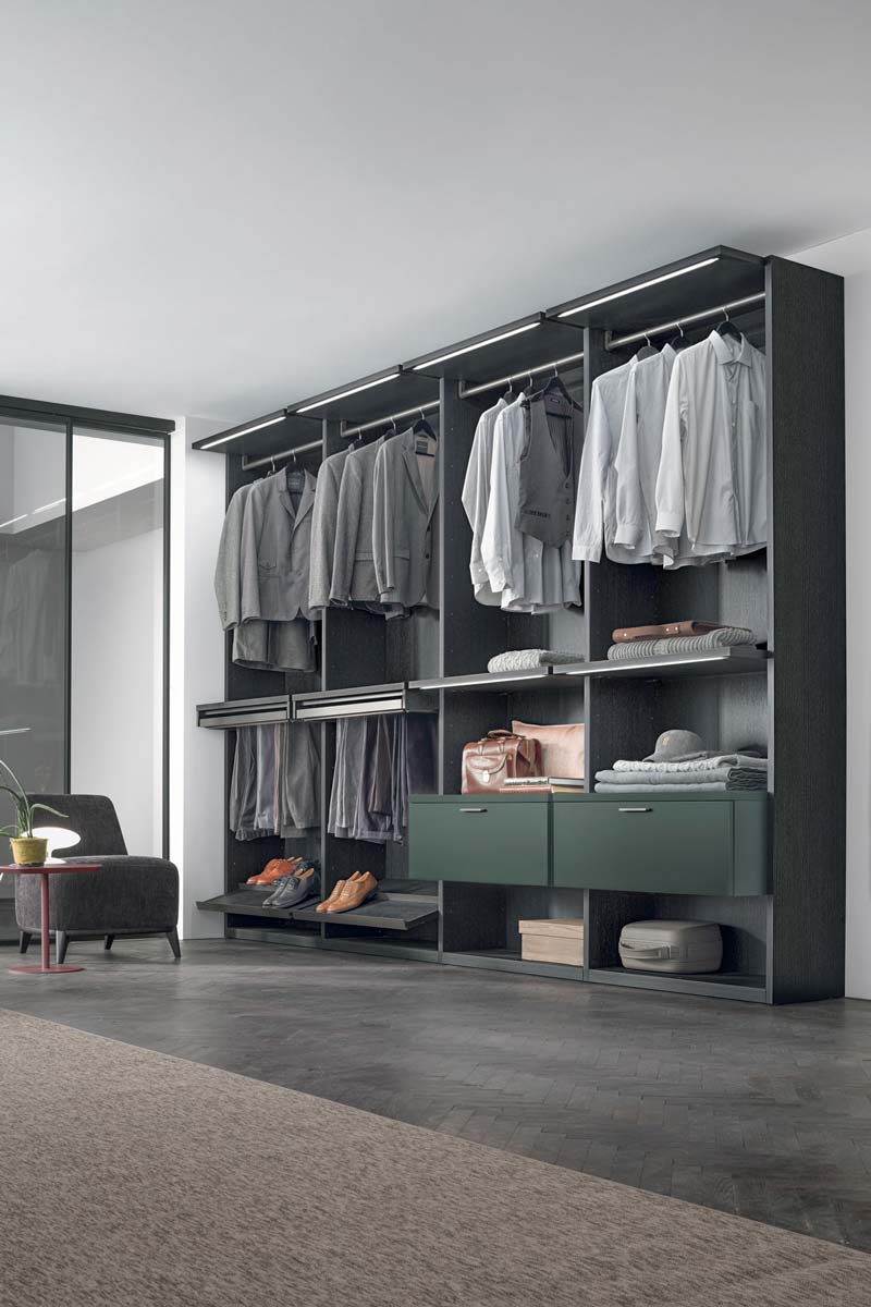 La cabina armadio Doxa è realizzata tramite un sistema a spalla con fianchi e divisori tra i quali si possono inserire ripiani, cassettiere e attrezzature. La sua particolarità si riscontra nel fianco meno profondo rispetto agli accessori che rende visivamente più leggera la struttura.