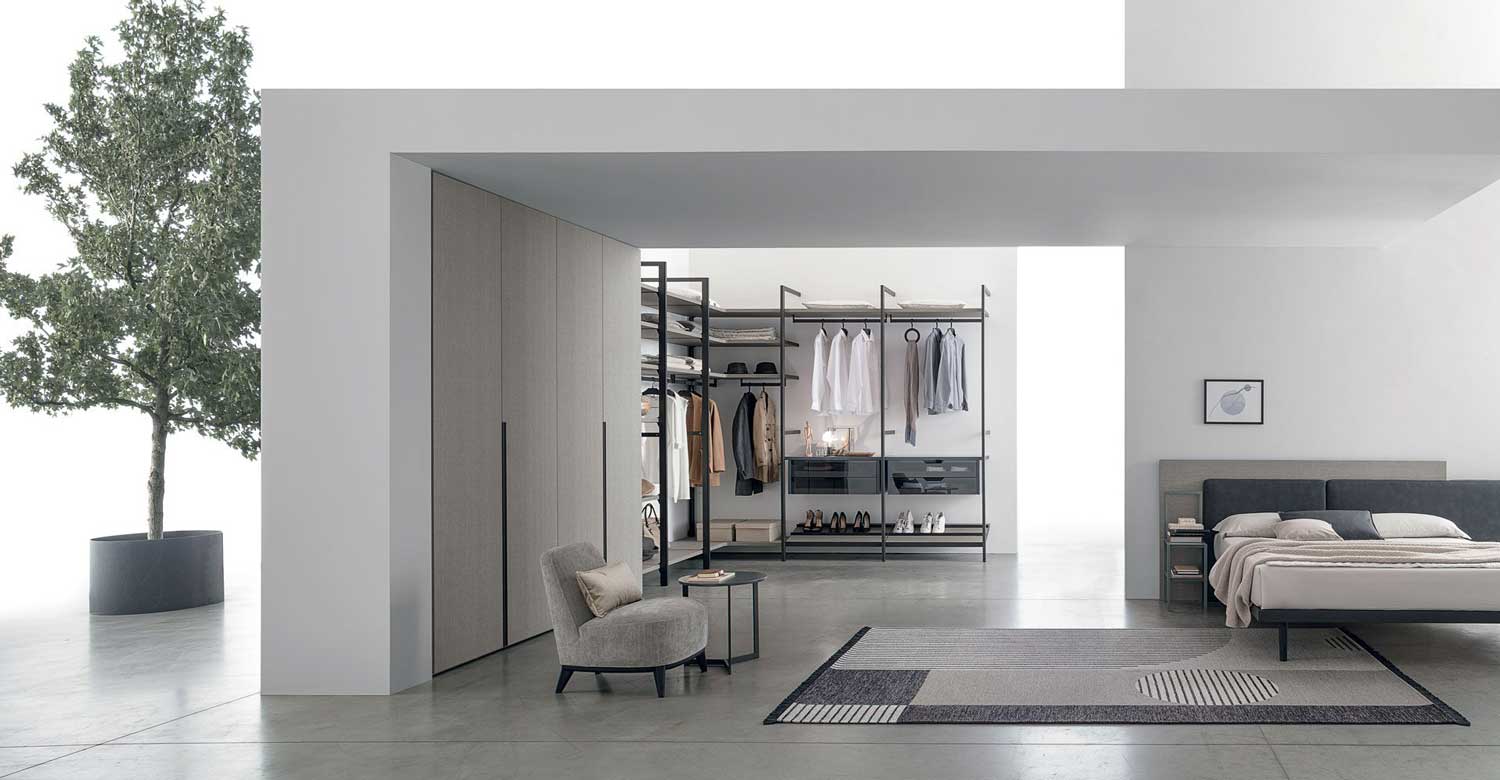 Liberty è la cabina armadio composta da montanti metallici che possono essere fissati a parete o a soffitto, adattandosi in questo modo anche ad ambienti mansardati. Si agganciano ai telai mensole, cassetti e accessori vari.