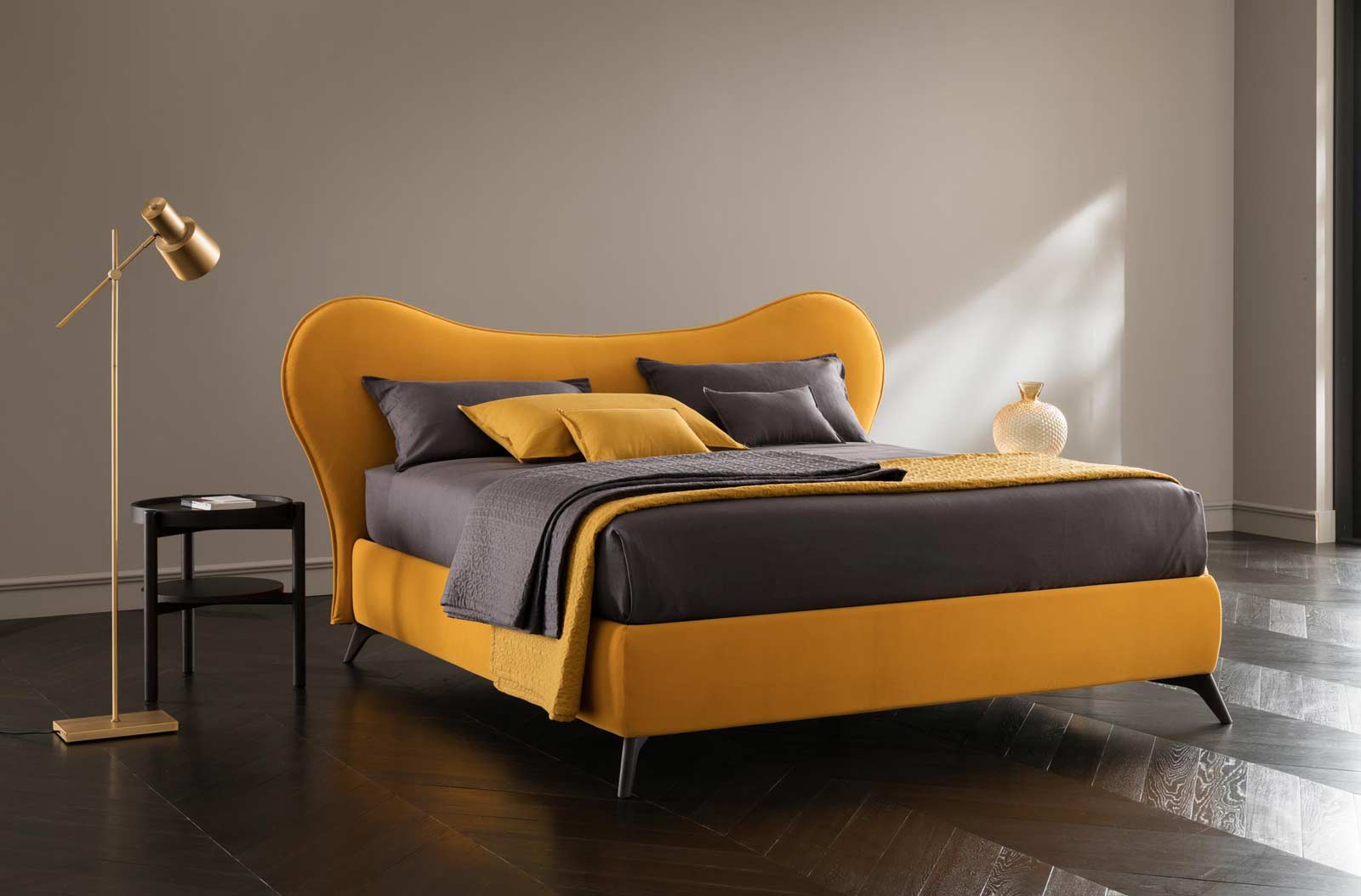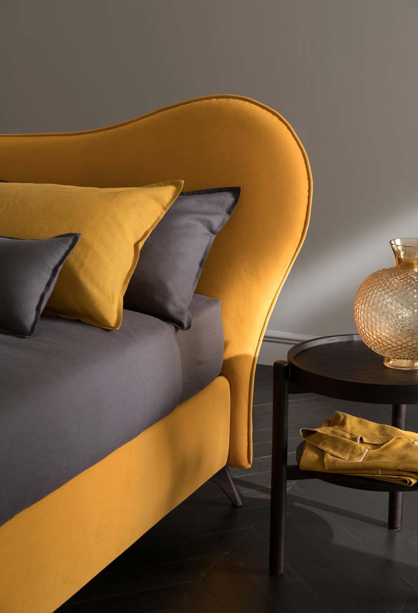 Mickey è un letto dalla personalità forte grazie alla testiera ampia e particolare. Il disegno è formato da una linea morbida e sinuosa. Tessuto e colore lo renderanno più romantico o divertente a seconda del gusto.