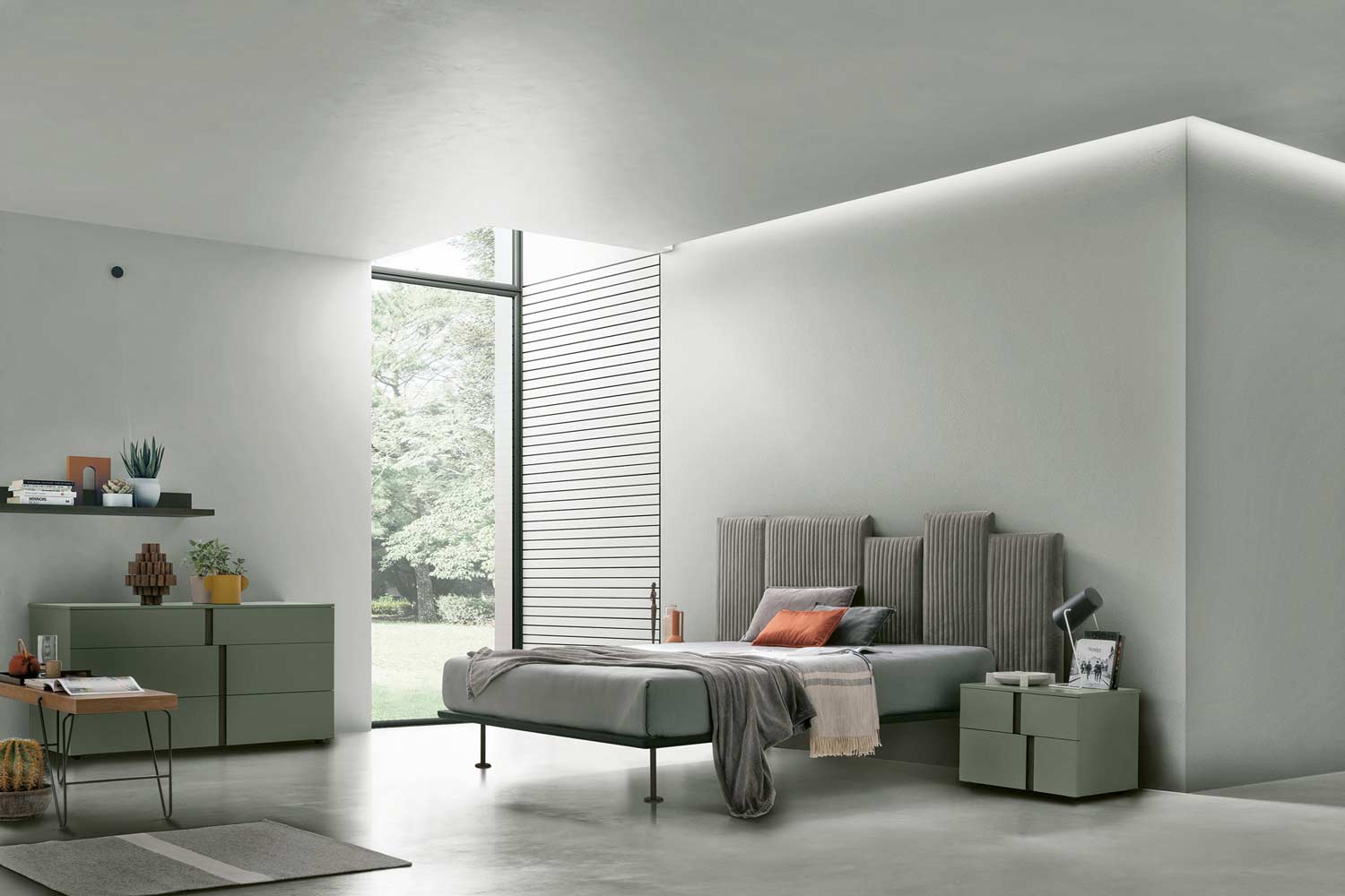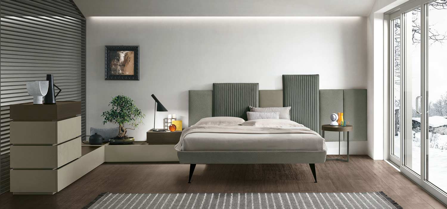 Il letto Skyline si ispira ai profili delle città metropolitane. I pannelli della testiera di varie dimensioni e finiture disegnano diversi livelli. Il letto con la testiera Skyline avrà quindi un impatto decorativo importante per tutta la camera.