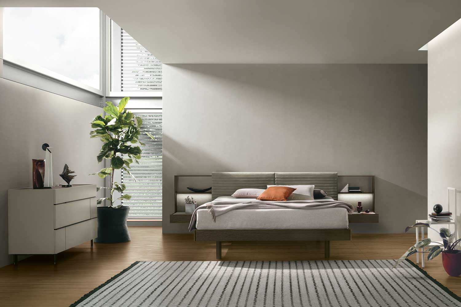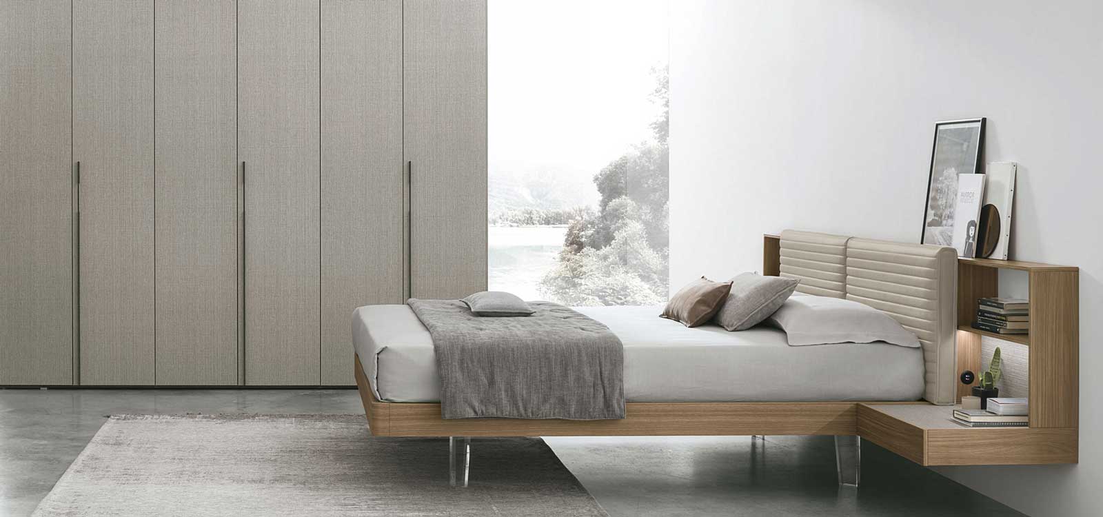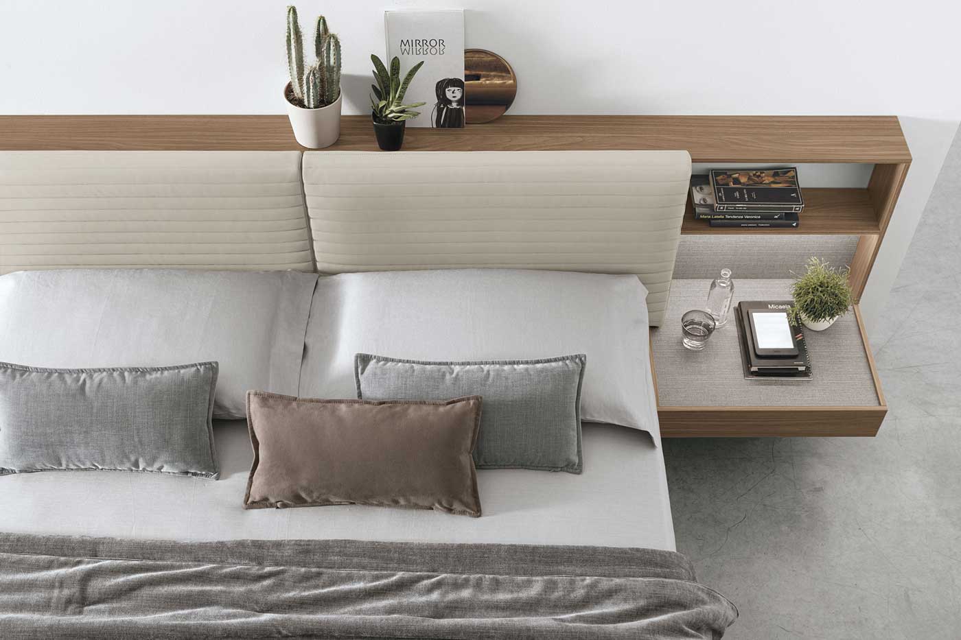 Il letto Yuki è un sistema che integra più elementi e funzioni. Due cuscini imbottiti fanno da testiera, i comodini sono uniti al letto e anche tra di loro tramite un mensolone che diventa piano di appoggio e la schiena dei comodini accoglie una pratica mensola. E’ possibile aggiungere una luce integrata alla mensola che illumini il piano dei comodini e sia pratica anche per la lettura oltre ad una presa elettrica lateralmente.