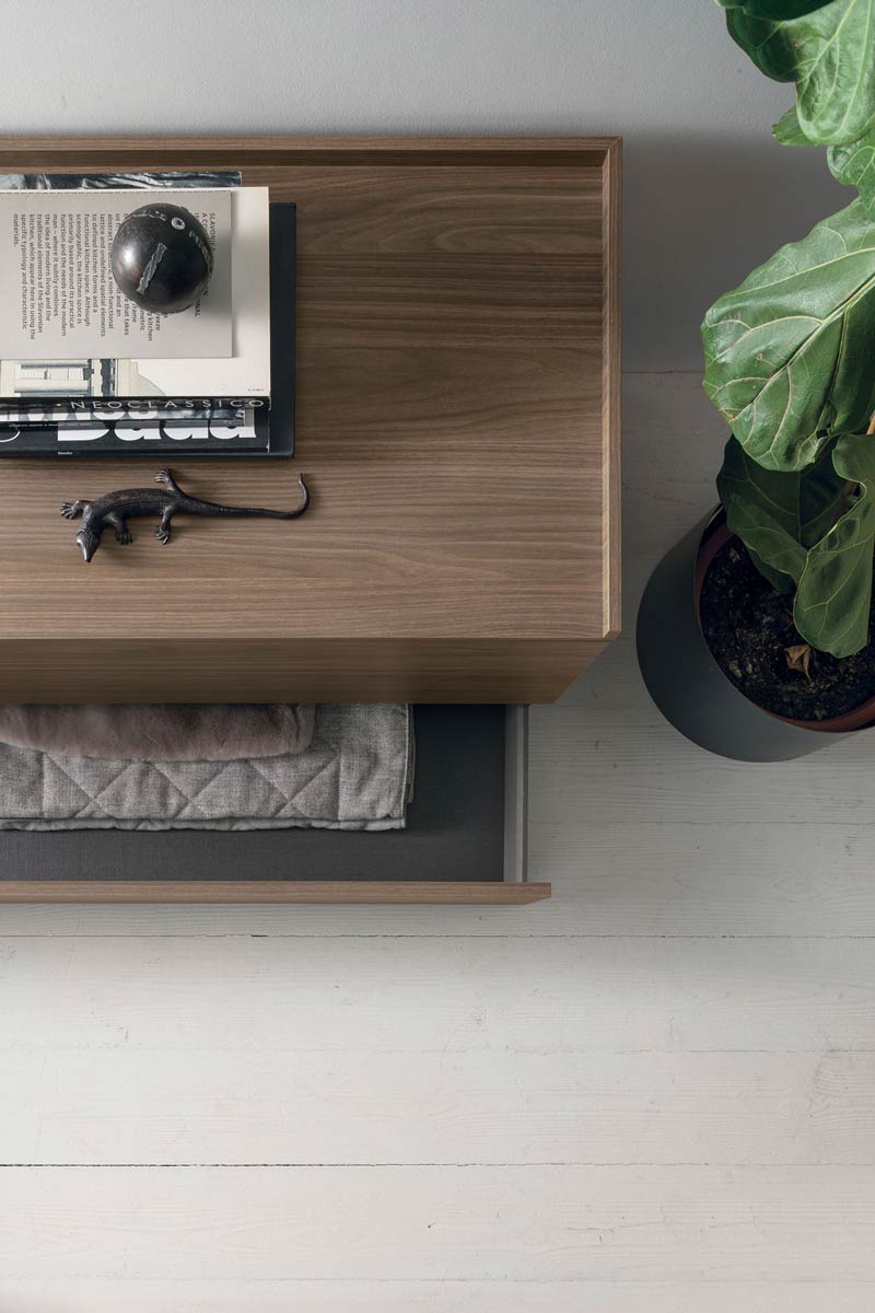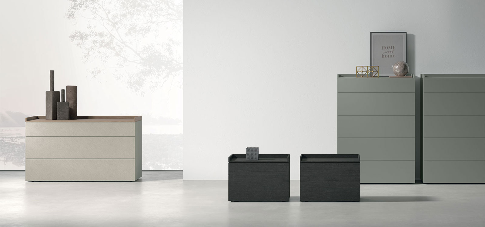 Gli arredi del gruppo Sir presentano un design lineare valorizzato da un dettaglio di stile originale: il top a vassoio. Questo elemento è personalizzabile nella finitura e aggiunge un’inconfondibile impronta stilistica a comò, comodini e settimanali.