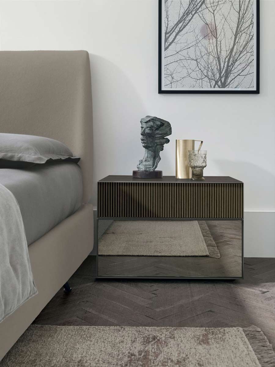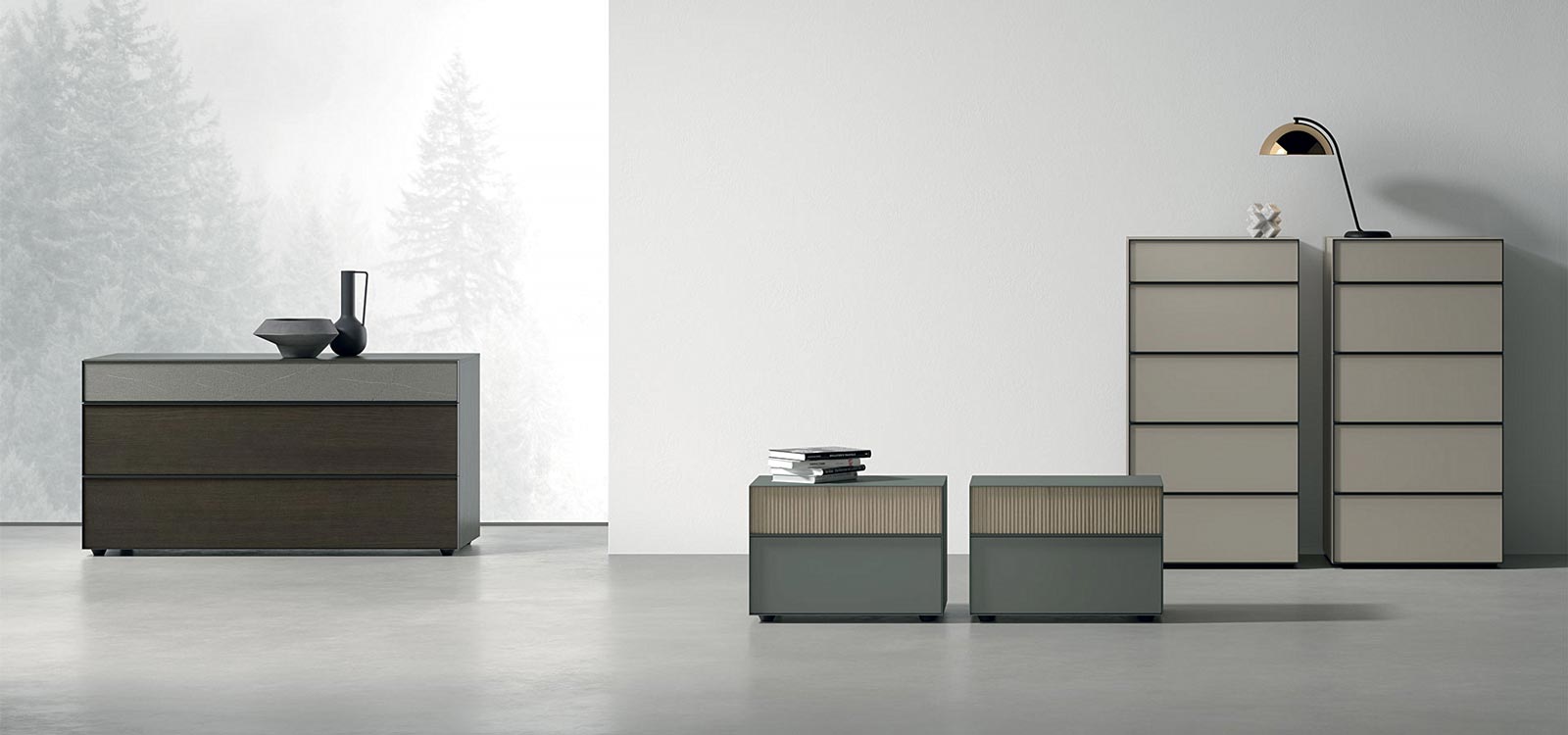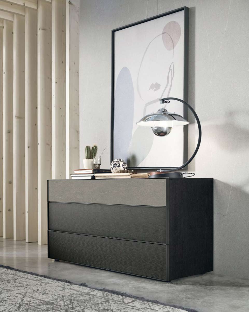 Il gruppo Vinci è caratterizzato dal profilo in metallo che rifinisce i lati di tutti i frontali. Questo dettaglio crea una cornice ai frontali e valorizza le finiture di comò e comodini. Tutti gli arredi presentano un design minimal ma un forte carattere estetico.